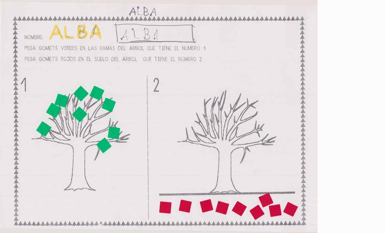 Para consolidar este concepto hemos realizado una ficha en la que pegábamos gomets verdes en las ramas del árbol que tenía el número 1 y gomets rojos en el suelo del árbol que tenía el número 2.