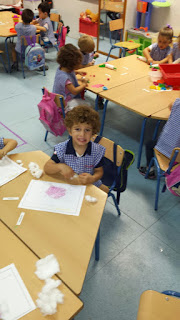 Les ha gustado mucho eso de hacer pedacitos de algodón y pegarlo. Con esta actividad, además de trabajar otra técnicas plástica, se fomenta el desarrollo de la motricidad fina.