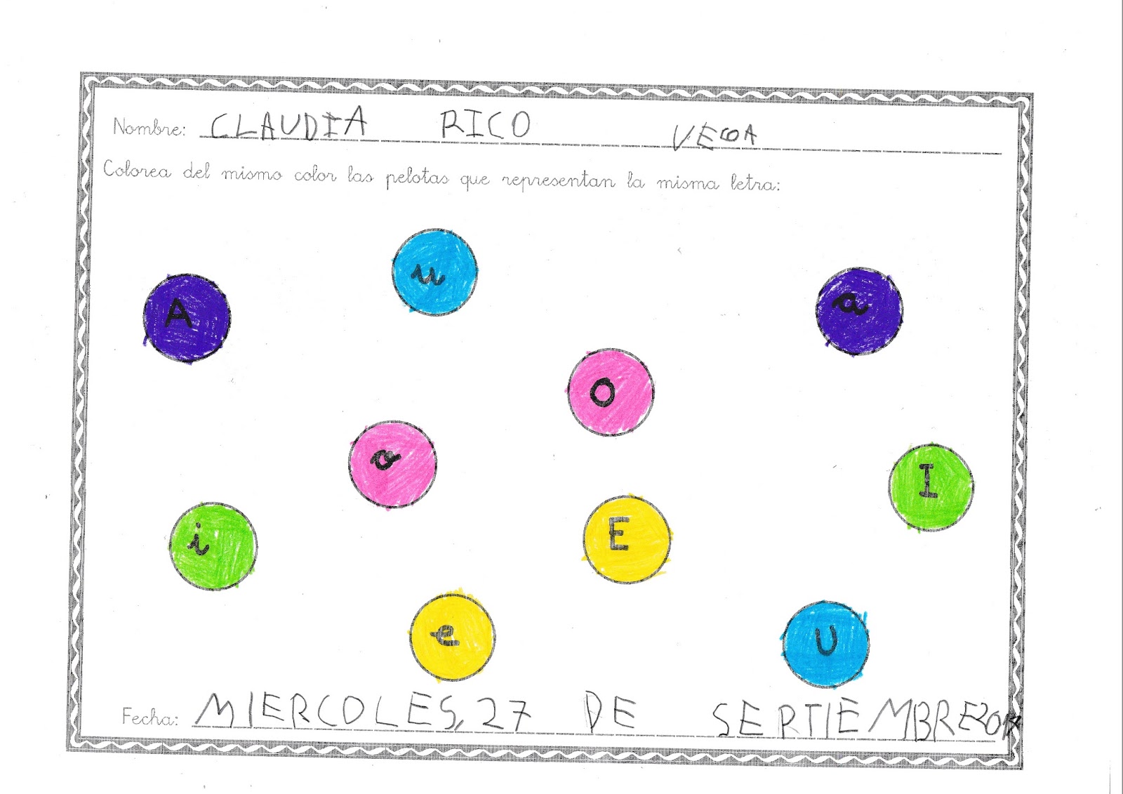Para afianzar lo trabajado, hemos realizado una actividad en la que el alumnado ha coloreado las bolas que representan la misma letra con el mismo color.